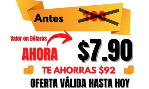 Si tomas acción en los próximos minutos HOY OBTIENES este SUPER DESCUENTO del 92%, para que no pagues los $ 99.00 que vale y pagues tan SOLO $ 7,90 Dólares que pagarás en tu moneda local.